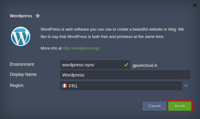 Click Install and provide the required details, such as Environment, Display Name (alias) and Region (if several regions are available).