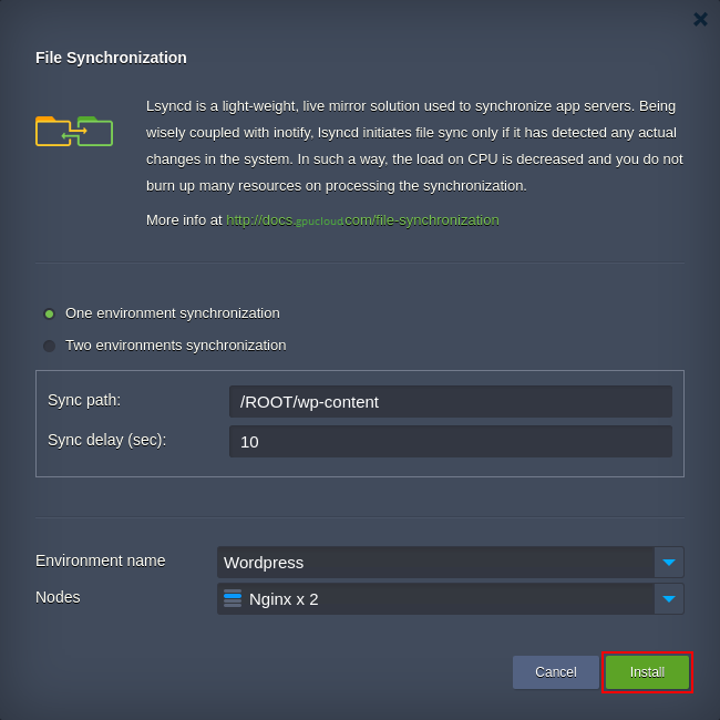 The File Sync add-on can be installed on top of any GPUonCLOUD-managed application server stack (i.e. except for Docker containers). Before the appliance, you will be asked to select the folder to synchronize. In this way, you are able to sync only the part of your app server’s file system that actually requires this. Thus, only changes within the selected directory (on any of specified application server instances) will trigger the synchronization.