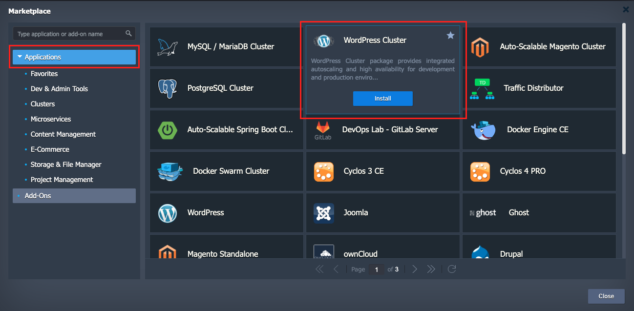 1.You can install your WordPress application manually or locate the appropriate one-click package in Marketplace to deploy it automatically.
