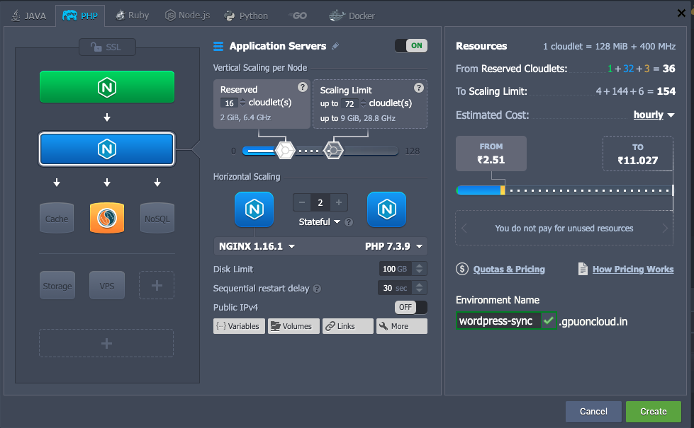 2. Click Change environment topology and use the + button within the Horizontal Scaling section to add one more app server node and, this way, to create a cluster.
