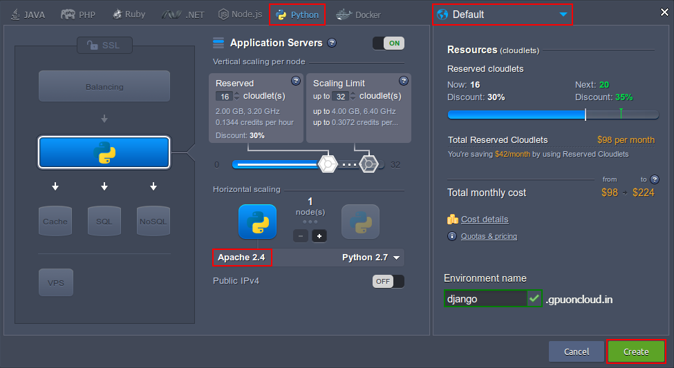 2. Navigate to the Python programming language tab, where the Apache application server will be selected automatically. State the resource limits, choose the region and enter the name (e.g. Django) for your environment.