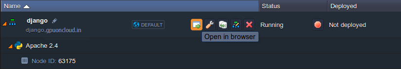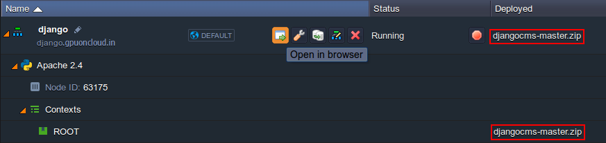 11. That’s all! Now, you can return to the dashboard and press Open in browser button next to your environment with Django CMS.