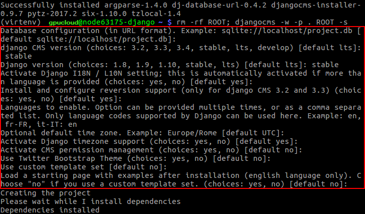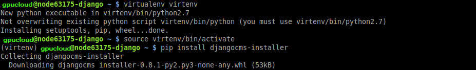 4. Now, let’s get and run the Django CMS installer script using the pip package manager: