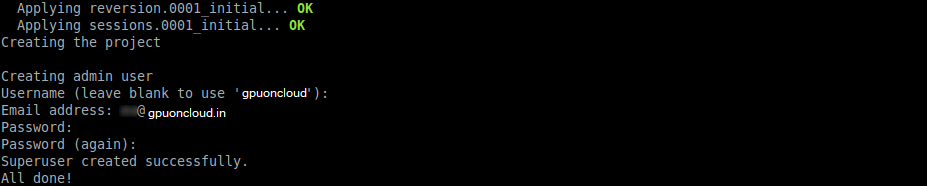 7. When the application is configured, you’ll be asked to specify Username, Email and Password for your CMS administrator (superuser):