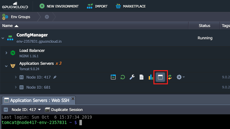 Just click the Web SSH button next to the required layer or a particular node for the tab with terminal emulator to be opened:
