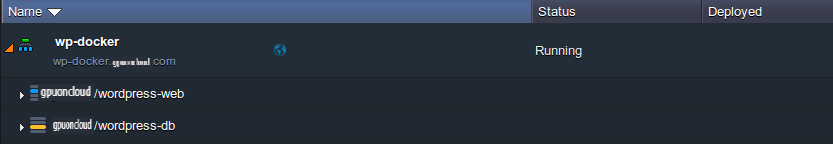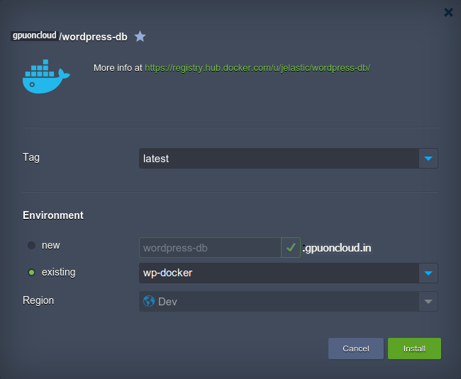 For this example, we’ll add the WP DB template to the already created GPUonCLOUD/wordpress-web one (as together they can run this powerful web application). Click Install, when ready.