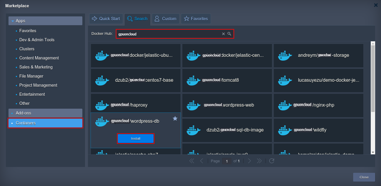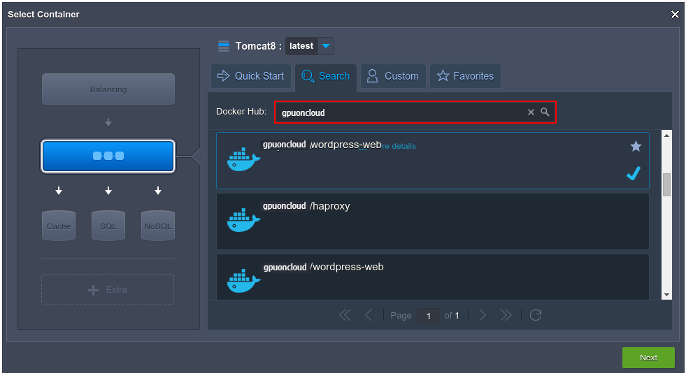 As an example, let’s use the search via the official Hub Registry – navigate to the same-named tab, type the full or part of the required name to the input field (e.g. GPUonCLOUD) and hit Enter. After being shown the list of results, simply click on the prefered template to add it to the chosen layer (it will be marked with a tick and become highlighted). The necessary tag can be selected within the drop-down list next to the image name at the upper part of the frame.